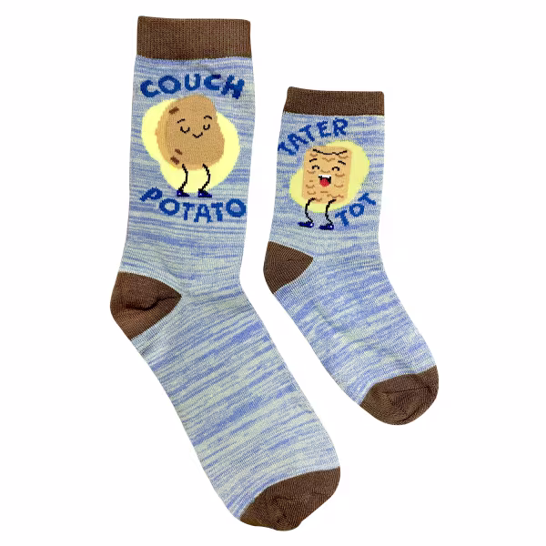 For the parent who loves to lounge with their little one, this sock set is for the two of you. These blue marled socks give you both the power to own your couch potato status. Adult size says "Couch Potato" with a cute character graphic. And for the kid, there's "Tater Tot."