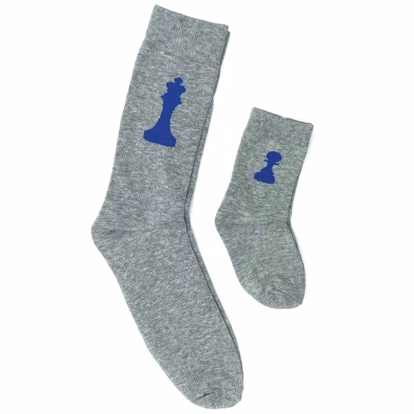 Strategize your wardrobe with matching chess themed socks for you and your favorite little player. Adult size features a bold blue king piece graphic. The kid size has a pawn. Both look great on a heather grey background. You're sure to be a winning pair when stepping out in these.