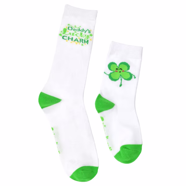 Whether you're Irish or not, you're in luck with this adorable set! Both pairs of socks are white with pops of bright green. Dad's says "Daddy's Lucky charm." And kid's size features a bold four-leaved clover graphic.