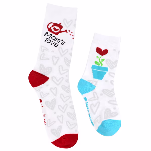 Mom's love makes little ones grow! Adult socks feature subtle gray hearts and a bright red watering can graphic pouring love. Kid's socks have the same pattern with a flower blooming from a turquoise pot.