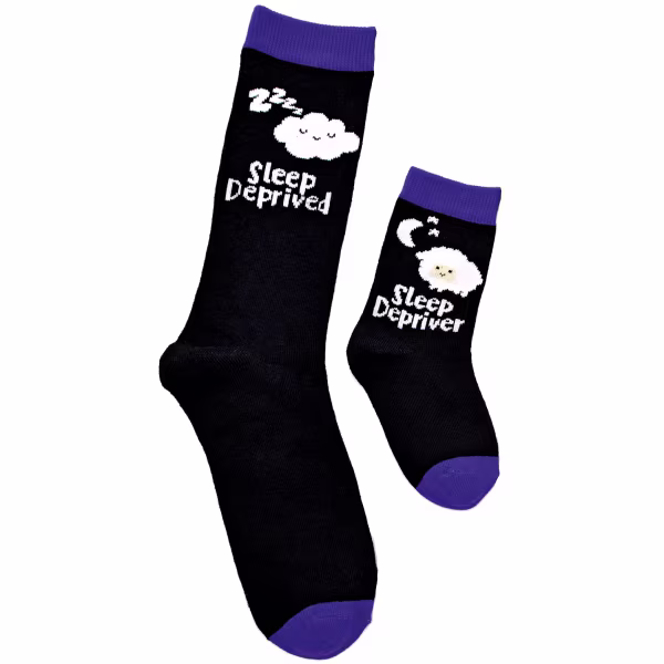 Sleep deprivation is a parental right of passage! White clouds and lettering stand out on black socks with purple accents. Mom's: "Sleep Deprived". Kid's: "Sleep Depriver".