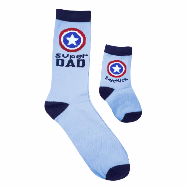 They say that not all heroes wear capes and that's certainly true of dads! They do, however, wear socks. SuperDad and Sidekick socks are a fun way to wear your hero status along with your little protégé. Light blue with contrasting navy "hero" star make these a super compliment to both of your outfits.