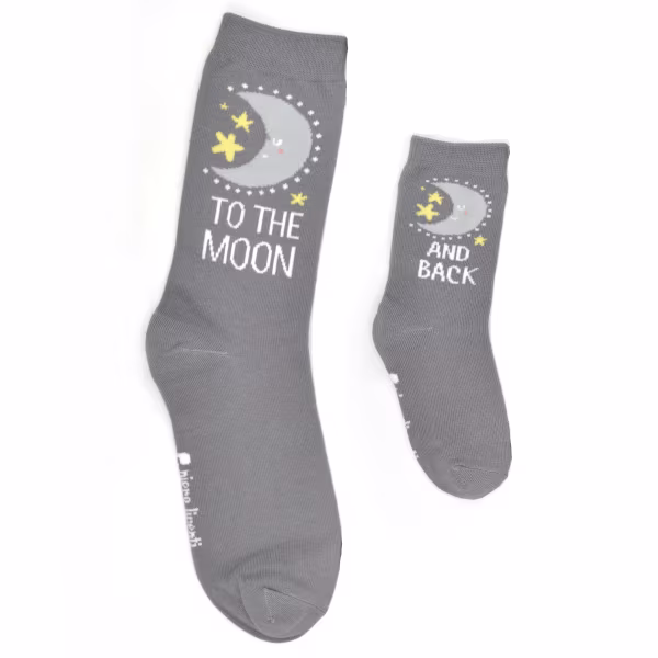 Express your true feelings for each other with socks that say it all. Subtle gray shows off a cool moon and stars design on each pair in this set. Mom's says "To the Moon." Kid's says "And Back."