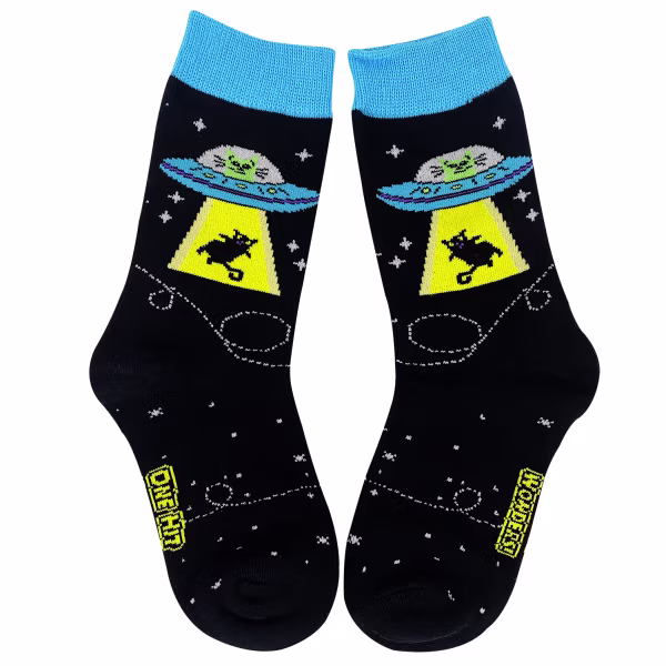 Prepare for an intergalactic purr-suit! These black socks feature an out-of-this-world design: an alien cat abducting a regular feline friend. Perfect for kids with a cosmic sense of humor and a love for the unexpected.