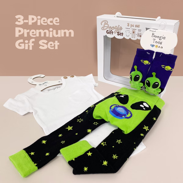 This adorable Baby Premium Gift Set containing a matching Boogie Toes Rattle socks pair, a Boogie Tights baby legging and a Boogie tee's Baby Bodysuit.