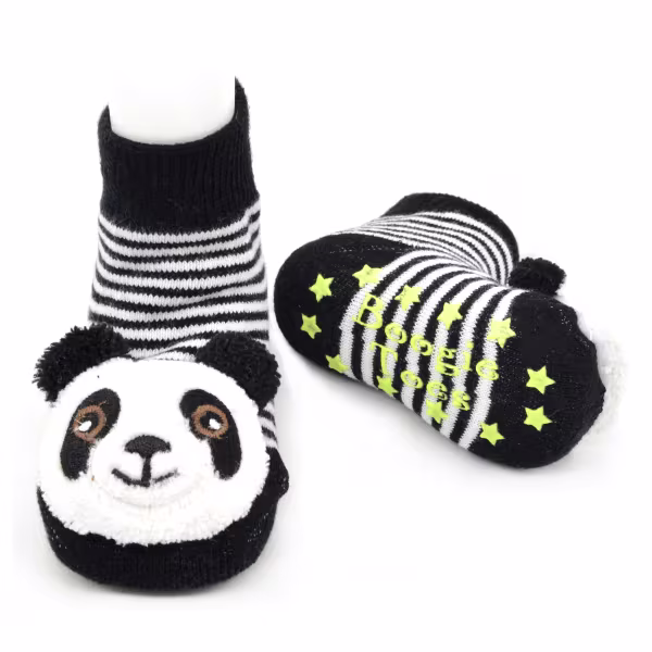 Rubber grip-bottoms deliver traction for new walkers. And friendly stuffed panda faces double as rattles.