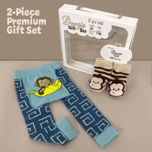 This adorable 2pc Baby Gift Set contains a matching Boogie Toes Rattle socks pair and a Boogie Tights baby leggings.
