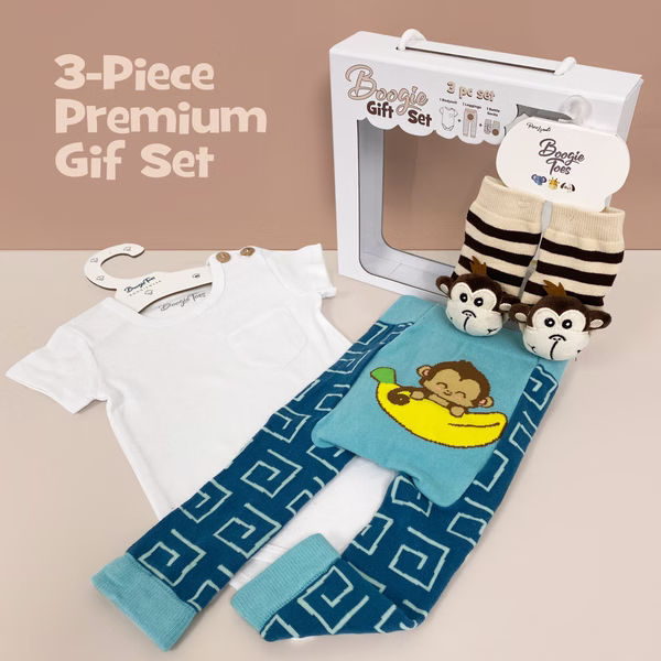This adorable Baby Premium Gift Set containing a matching Boogie Toes Rattle socks pair, a Boogie Tights baby legging and a Boogie tee's Baby Bodysuit.
