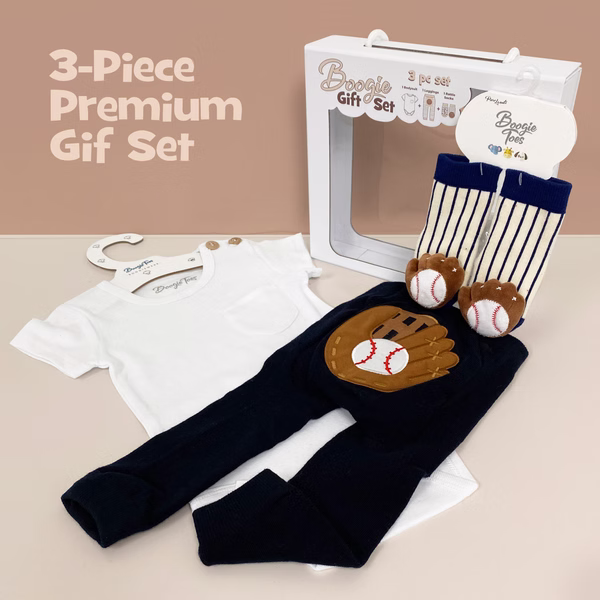 This adorable Baby Premium Gift Set containing a matching Boogie Toes Rattle socks pair, a Boogie Tights baby legging and a Boogie tee's Baby Bodysuit.