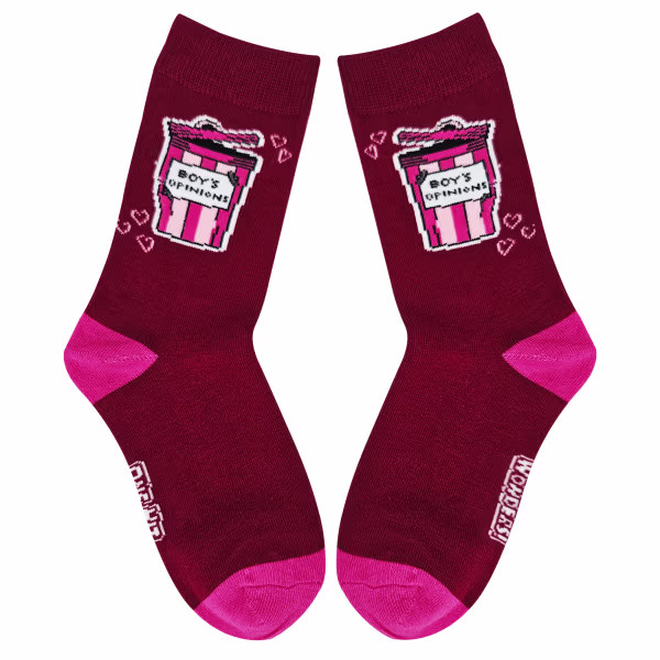 Not all opinions belong in the suggestion box! These bold burgundy socks feature a trash can and a sticker that says "Boy’s Opinions." Perfect for kids with big personalities and even bigger comebacks.