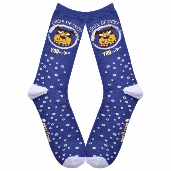 Trust no one! That's the takeaway from these fun and snarky socks featuring a cartoon dog looking just a little bit annoyed.