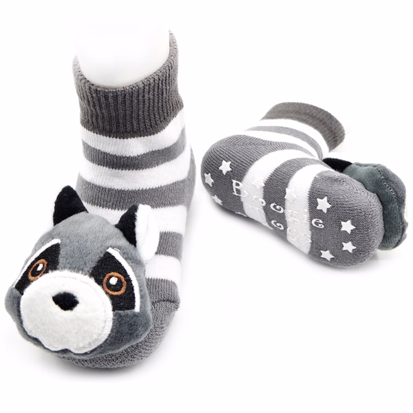 Rubber grip-bottoms provide traction for new walkers. And stuffed raccoon faces double as rattles.