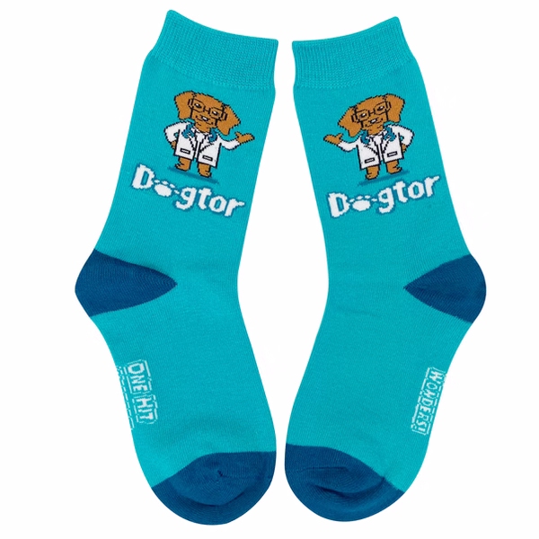 Feeling ruff? These turquoise socks are just what the "dogtor" ordered! They feature an adorable dog dressed as a doctor, complete with the word "dogtor." Perfect for kids who love animals and a good giggle.