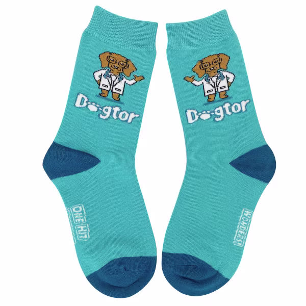 Feeling ruff? These turquoise socks are just what the "dogtor" ordered! They feature an adorable dog dressed as a doctor, complete with the word "dogtor." Perfect for kids who love animals and a good giggle.
