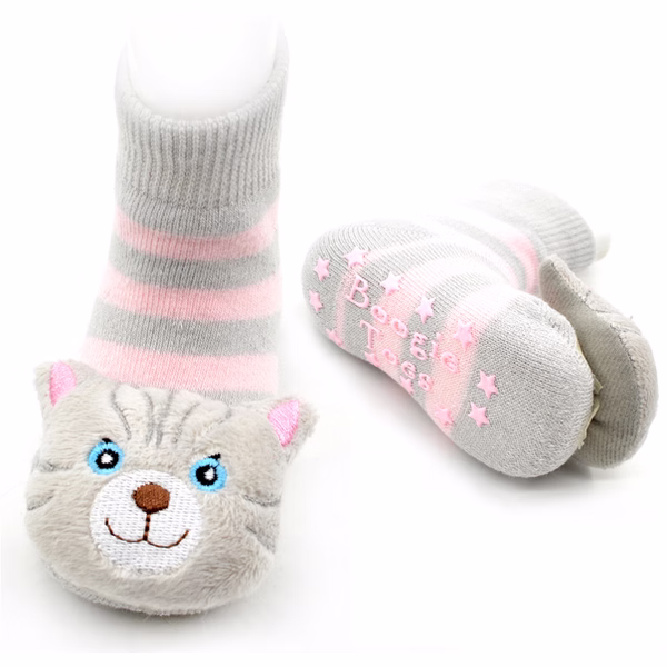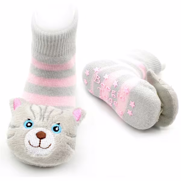 Rubber grip-bottoms provide traction for new walkers and adorable stuffed kitty faces double as rattles.