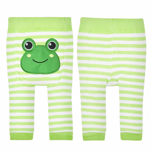 Bright green and white stripes are so cheerful and the perfect compliment to a frog face that will make you and your little one jump for joy.