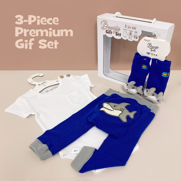 This adorable Baby Premium Gift Set containing a matching Boogie Toes Rattle socks pair, a Boogie Tights baby legging and a Boogie tee's Baby Bodysuit.