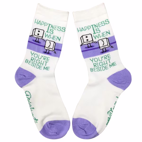 Texting remains the communication of choice for tweens. Now kids can create smiles with keystrokes and these fun socks that say "Happiness is When You're Right Beside Me." Cute keyboard keys hold hands on top of pretty lavender accents.