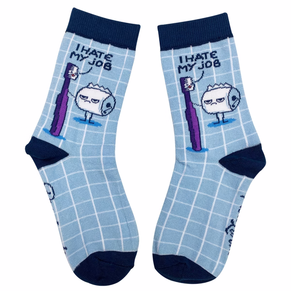 Here's a silly sock set that lampoons the dirtiest jobs. Cartoon toilet paper looks annoyed when toothbrush says, "I hate my job." Blue and white windowpane pattern adds even more fun to this pair.