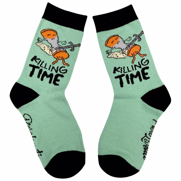 Here's a comical take on the phrase "Killing Time." A cartoon hourglass is pierced by a sword, causing sand to pour out. These minty green colored socks are perfect for fans of cheeky wordplay.