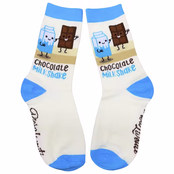 These socks are as sweet as can be! Cute cartoon chocolate bar shakes hands with adorable milk carton. That's makes it a Chocolate Milkshake! Blue accents coordinate with any tween ensemble.