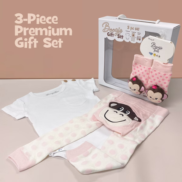 This adorable Baby Premium Gift Set containing a matching Boogie Toes Rattle socks pair, a Boogie Tights baby legging and a Boogie tee's Baby Bodysuit.