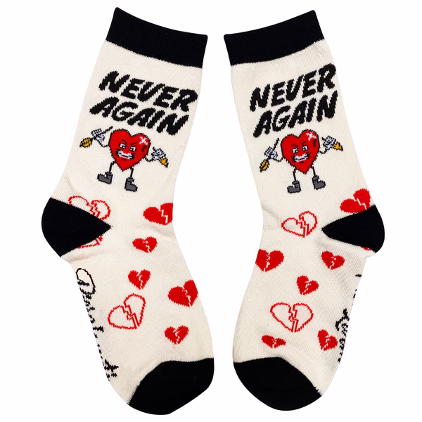Let off steam about that unrequited crush! It's all part of growing up and these socks are the perfect accessory when young love doesn't work out. An angry red heart cartoon with broken heart print says it all with the words "Never Again."