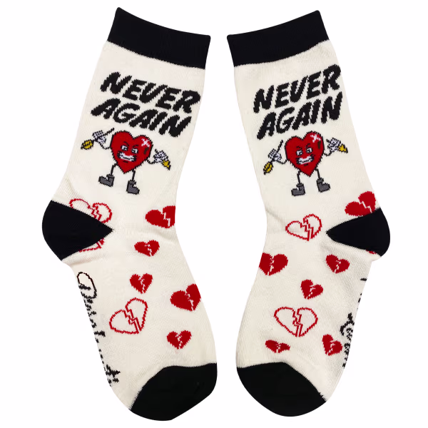 Let off steam about that unrequited crush! It's all part of growing up and these socks are the perfect accessory when young love doesn't work out. An angry red heart cartoon with broken heart print says it all with the words "Never Again."