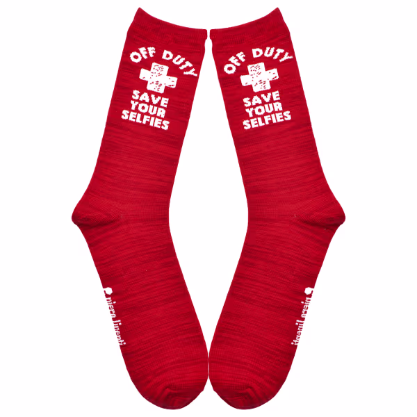 A slightly offbeat play on off-duty signs for lifeguards, these socks implore you to save your "selfies."