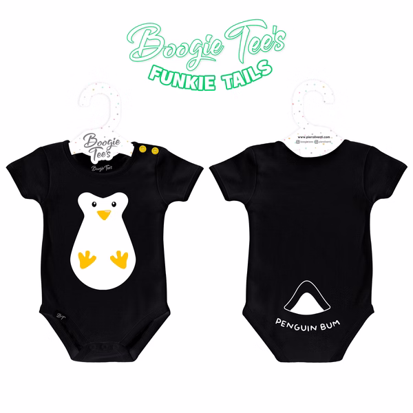 Everyone loves a penguin! This little one takes center stage at the front of a soft black onesie. On the back is a little penguin tail and the words "penguin bum." Yellow buttons at the shoulders match the penguin's beak and feet!