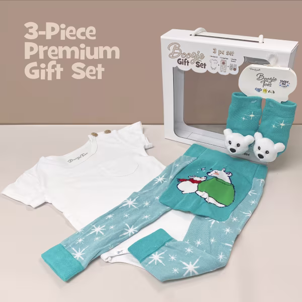 This adorable Baby Gift Set containing a matching Boogie Toes Rattle socks pair, a Boogie Tights baby legging and a Boogie tee's Baby Bodysuit.