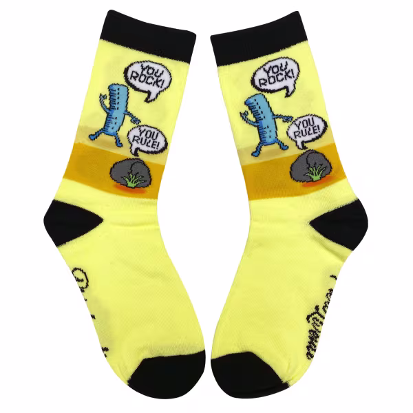 Tweens rock. Tweens rule. These lemon yellow socks with a cartoon ruler and rock giving each other props will make any outfit stand out. Black and orange accents complete the look.