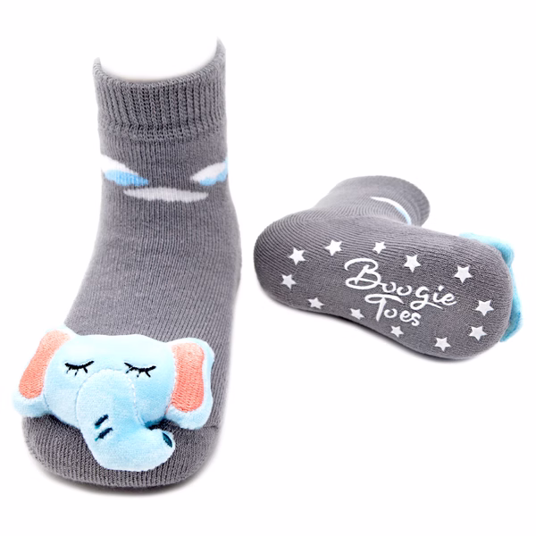 With a peaceful expression and the sweetest little trunk and tusks, these Boogie Toes feature calming blue and grey tones and a cute little paw print near the sock top!