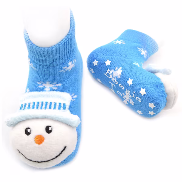 Rubber grip-bottoms provide traction for new walkers and adorable stuffed snowman faces double as rattles.