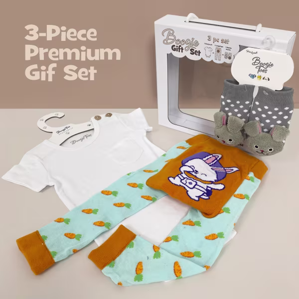 This adorable Baby Gift Set containing a matching Boogie Toes Rattle socks pair, a Boogie Tights baby legging and a Boogie tee's Baby Bodysuit.