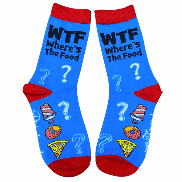 No worries, it's good clean fun! WTF stands for "Where's the Food," words uttered by hungry tweens everywhere. Bright blue socks look cool with black lettering, snack graphics and red accents.