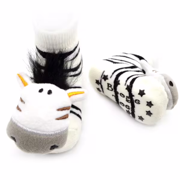 Stripes go all the way up the sock and rubber grip-bottoms provide traction for new walkers. Friendly stuffed zebra faces even double as rattles.